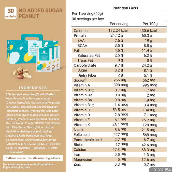 【THE VEGAN】Classic Plant-Based Protein - No Extra Added Sweetness Peanut (Box of 30 sachets)